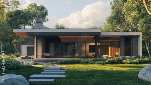 © artzone, Fototapeta premium Modern house exterior with large windows and a patio, surrounded by a lush garden. 3D rendering.