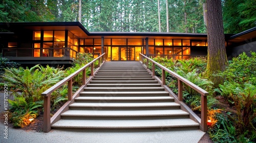 Obraz premium Modern house exterior with stairs surrounded by lush greenery and illuminated...