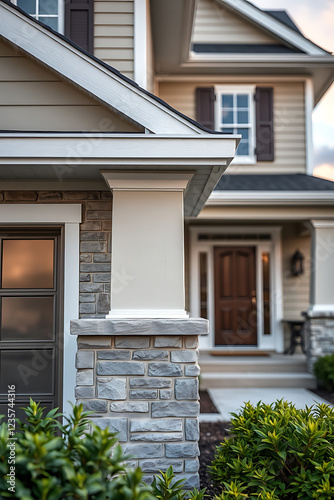 Obraz premium Modern House Exterior with Stone Details and Landscaping, Luxury Home Design,...