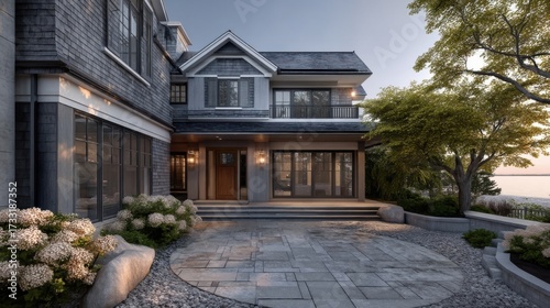 © hai, Obraz premium Modern house facade blending traditional and contemporary architecture, gray exterior with shingles, bay window balcony,