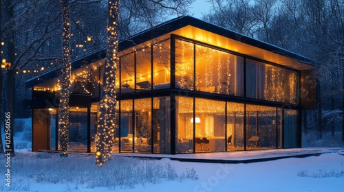 © RaksaLinggo, Obraz premium Modern house illuminated with festive lights in snowy landscape