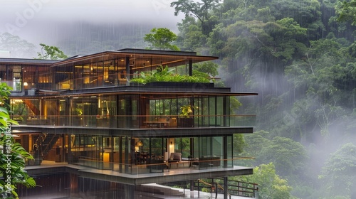 Obraz premium Modern house integrated into a rainforest, showcasing eco-friendly architecture and sustainable living.