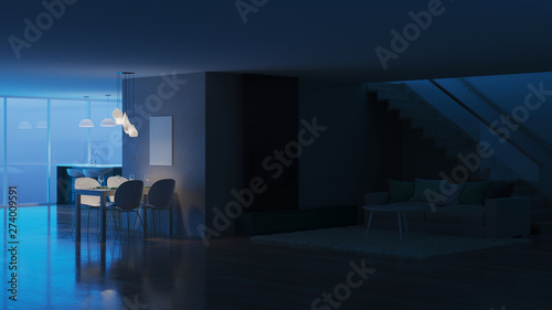 Obraz premium Modern house interior. Night. Evening lighting. 3D rendering.
