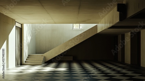 Obraz premium Modern house interior, staircase, sunlight, checkered floor, architectural...