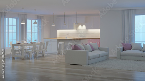 Fototapeta premium Modern house interior. White interior. Night. Evening lighting. 3D rendering.