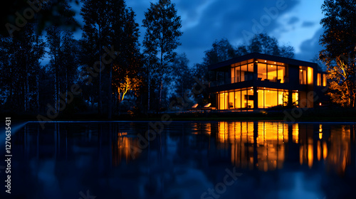 © PYP STOCK, Fototapeta premium Modern House Reflecting in Swimming Pool at Night with Illuminated Windows and Dark Blue Sky