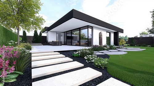 © ArtisticSnap, Fototapeta premium Modern house surrounded by garden, showcasing sleek design and landscaping.