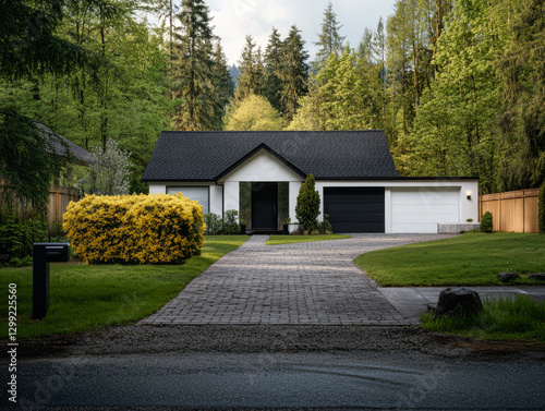 Fototapeta premium Modern house surrounded by greenery with well-maintained driveway and landscaping