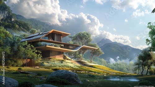 © SukarniStock, Obraz premium Modern house with a mountain backdrop, surrounded by lush greenery and a small pond.