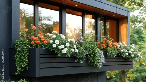 © HERMAWAN, Fototapeta premium Modern house with colorful flower boxes