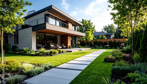 © sarina, Naklejka premium Modern house with garden, and sunny day.