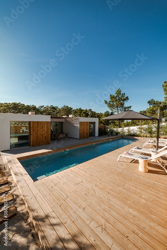 © Luis Viegas, Obraz premium Modern house with garden swimming pool and wooden deck