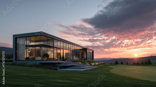 Fototapeta premium Modern house with glass walls at sunset in a scenic landscape view