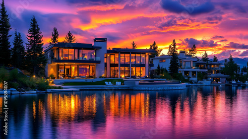 Naklejka premium Modern House with Lake View at Sunset - Realistic Image