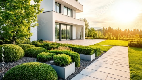 Fototapeta premium Modern House with Lush Greenery and a Stunning Sunset View