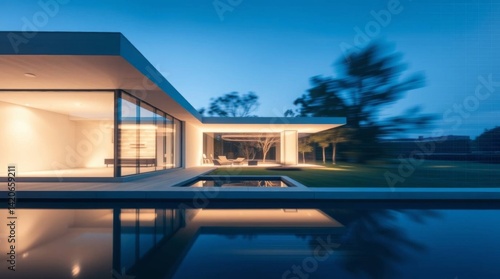 © Budi, Obraz premium Modern house with minimalist design and pool reflecting twilight sky view