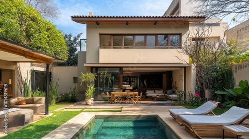 Fototapeta premium Modern House with Pool and Lush Garden