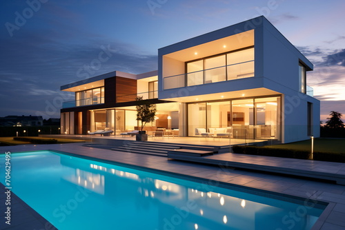 © duyina1990, Fototapeta premium Modern house with pool at night