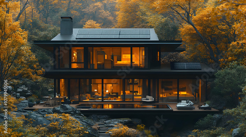 © _gexx_, Obraz premium Modern House with Pool in Autumn Forest - 3D Illustration