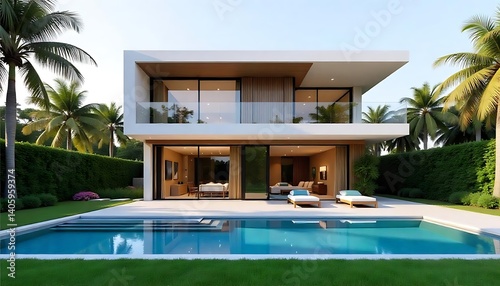 Fototapeta premium Modern House With Pool in Front ,Modern Luxury House With Private Swimming...