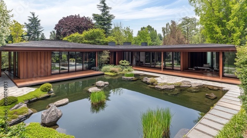 © Sampao, Obraz premium Modern House with Serene Garden and Water Feature