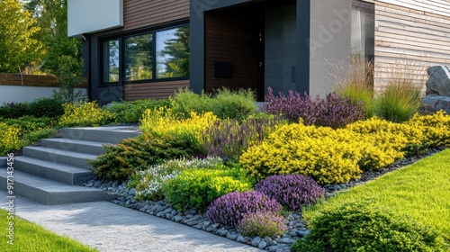 © Iswanto, Fototapeta premium Modern house with stone steps and beautiful flowerbeds with green grass and stones.