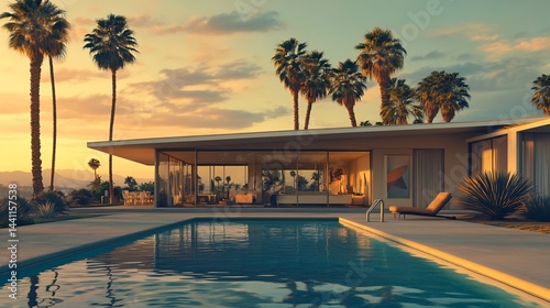 © DeepView, Fototapeta premium Modern House with Swimming Pool and Palm Trees at Sunset