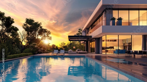 © Resi, Obraz premium Modern house with swimming pool enjoying a beautiful sunset