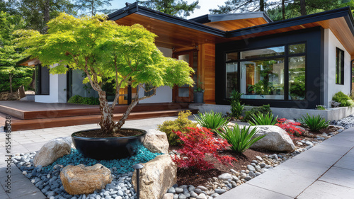 © Katerina Bond, Fototapeta premium Modern house with wooden accents and vibrant front yard landscaping featuring decorative rocks, potted tree, colorful shrubs and clean architectural lines.