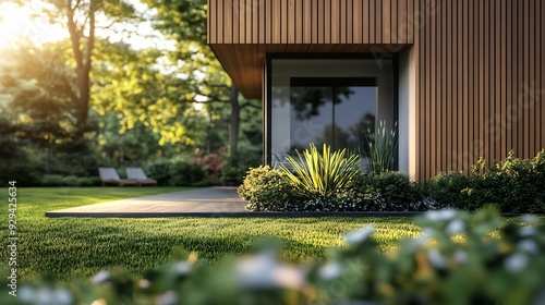 © The Little Hut, Obraz premium Modern house with wooden cladding panoramic window garden : Generative AI