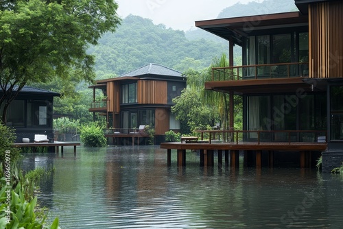 © jambulart, Obraz premium Modern houses, flooded, lush green hills.