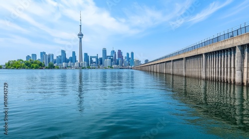 © Bullan, Naklejka premium Modern Hydroelectric Dam with City Skyline in Background
