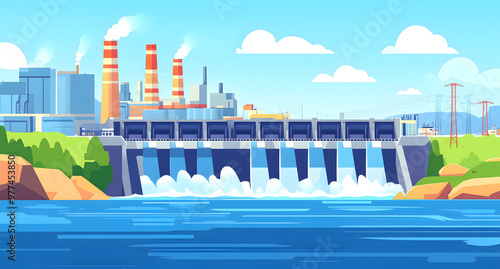 Naklejka premium Modern Hydroelectric Dam with Flowing Water and City Skyline in the Background