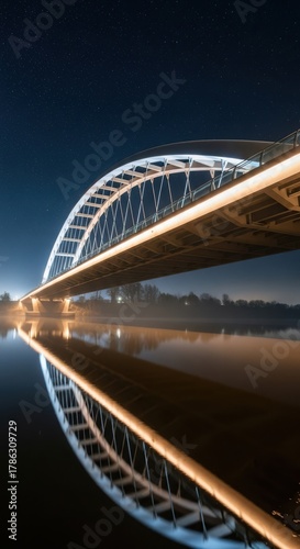 © Mehedi, Obraz premium Modern illuminated bridge arching over a calm river at night with vibrant lights reflecting on the water surface