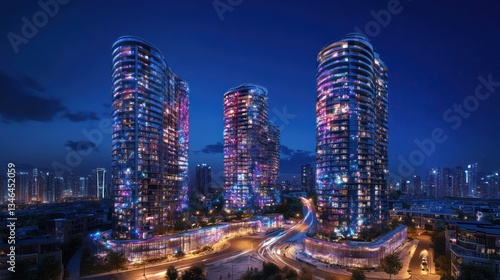 © Falikhurrosid, Fototapeta premium Modern illuminated skyscrapers at night