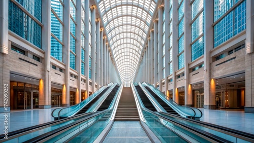 Fototapeta premium Modern indoor shopping center features glass architecture with escalators for easy access to upper levels in a bustling city