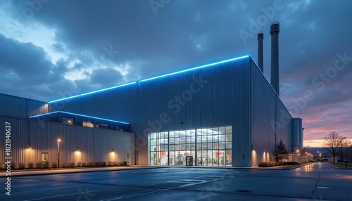 © miss irine, Naklejka premium Modern industrial building exterior lights at twilight. Huge factory complex with chimneys stands in clean industrial park. Advanced manufacturing site with glowing windows.