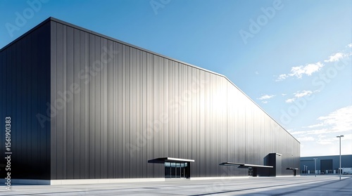 © Sri, Obraz premium Modern industrial building with a sleek, dark facade under a bright blue sky.