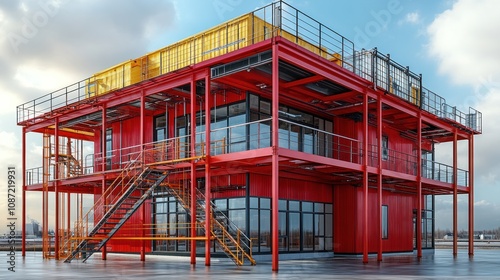 © julio, Obraz premium Modern industrial building with a vibrant red exterior and stairs.