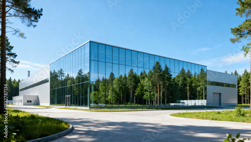 Fototapeta premium Modern Industrial Building with Glass Façade Surrounded by Lush Green Forest