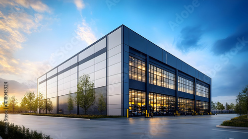 © Siasart Studio, Obraz premium Modern industrial building with large windows and loading docks.