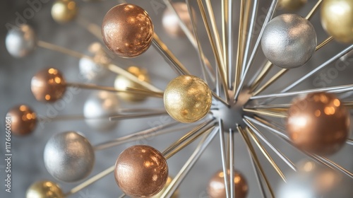 © OLEKSANDR, Obraz premium Modern industrial design with metal spheres and rods in gold, silver, and bronze