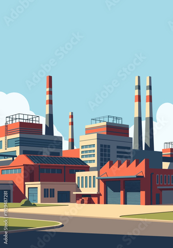 © Suhada, Obraz premium Modern Industrial Factory Buildings with Smokestacks.