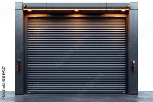 © mobile, Obraz premium Modern industrial metallic rolling shutter garage door with dark frame and overhead orange lighting in a clean minimal setting