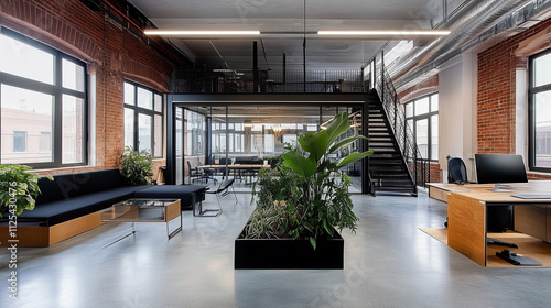Fototapeta premium Modern Industrial Office Space Design | Contemporary Open Plan Workspace with Natural Elements | Professional Interior Design with Exposed Brick and Glass Partitions | Urban Loft Style Commercial Offi