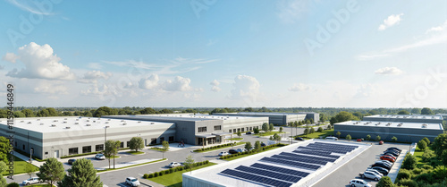 Obraz premium Modern industrial park with solar panels and clear blue sky
