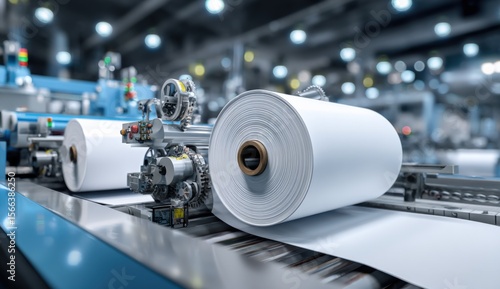 Fototapeta premium Modern industrial printing machine manufactu factory with large rolls of paper precision equipment for high volume production