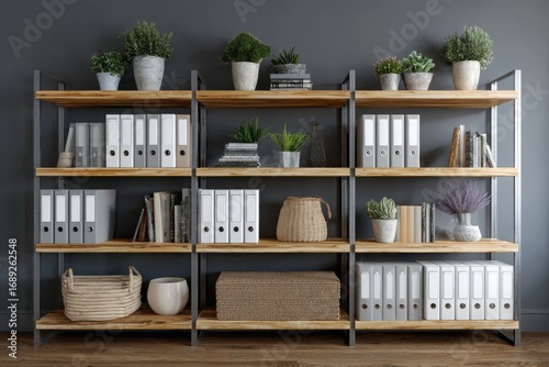 © NovaStock, Obraz premium Modern industrial shelving unit filled with binders books plants and decorative baskets against a dark gray wall