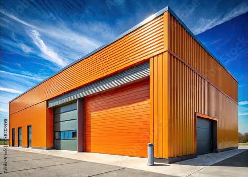 © DigitalArt Max, Fototapeta premium Modern Industrial Warehouse with Orange Roller Shutter Door - Contemporary Design, Urban Architecture, and Stylish Storage Solutions