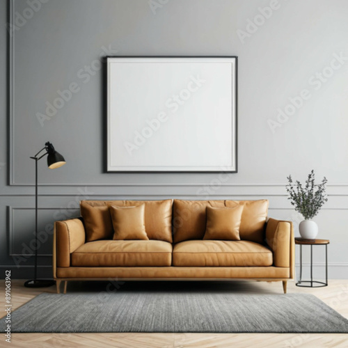 Fototapeta premium Modern interior background with empty frame mockup, minimalist living room design, contemporary wall art display, clean and stylish home decor, elegant space for branding and creative presentations